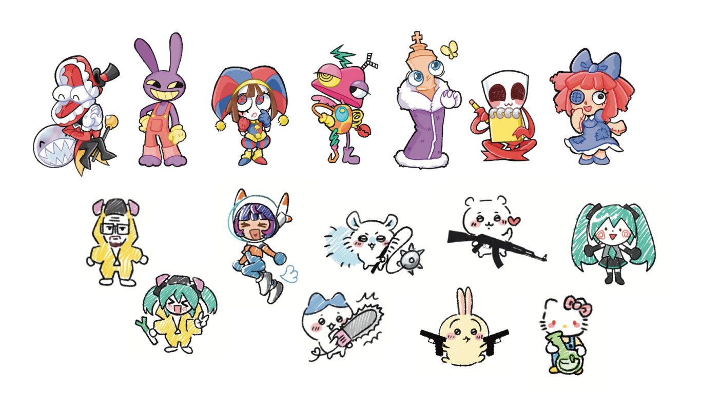 Monster High, My Hero Academia, Hunter x Hunter, Mob Psycho 100, Jujutsu Kaisen, Hazbin Hotel, Alien Stage, The Amazing Digital Circus